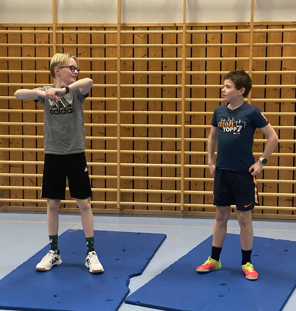 Godt var det allikevel å komme inn. Der hadde Krisitn gjort klart for stykende øvelser og morsomme stafettinnslag. Hver deltager fikk bestemme selv hvilke øvelser alle skulle gjøre i 5 minutter. Det ble en fin blanding og vi fikk styrket alle muskler som hadde hatt noe slapp tilværelse i jula. Over ser du at Martin og Erlend er mer enn klare for økta.