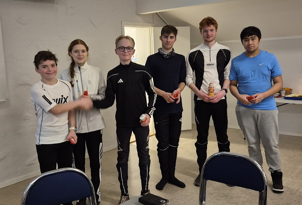 Her ser vi staute ungdommer med premier fra kveldens batalje i o-løypa. Erlend, Signe, Martin, Åsmund, Johannes og Phit.