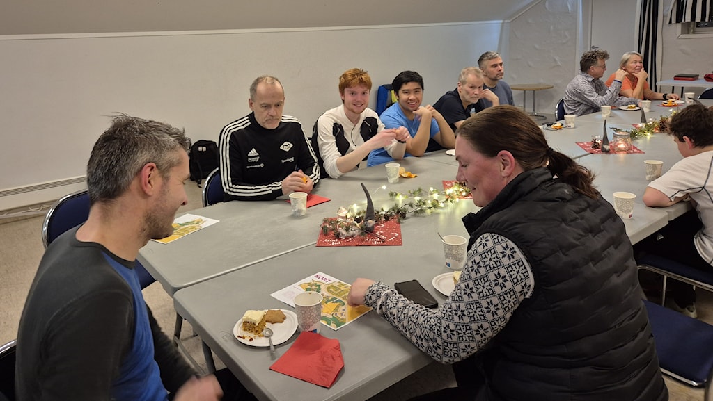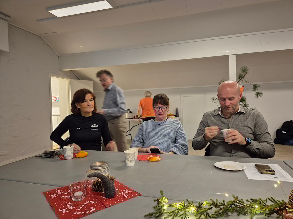 Arrangementkommiteen hadde satt ut rikelig med bord og stoler - trodde de, men det ble for lite. Et 20 talls o-løpere møtte til årets siste arrangement i orintering. Til pynting hadde vi vært så heldig å få samme designer som de forrige åra, nemlig Hege med siine nette og virkningsfulle lenker og pynt for øvrig.