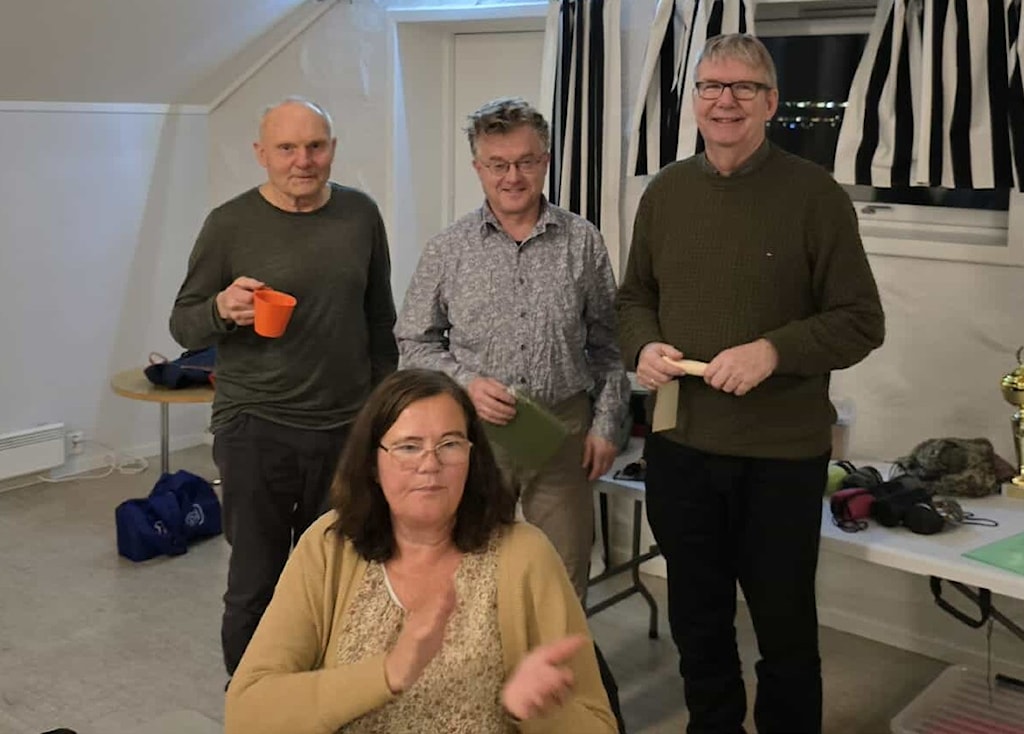 Eivind, John og Jan Petter med premier fra klassen H50-74, mens Mona fortsatt venter tålmodig.