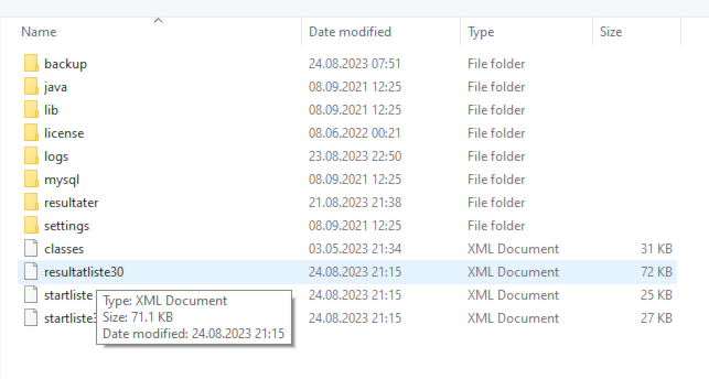 | Den nederste fanen blir grønn når XML-filene er lagret. Det blir lagret forskjellige xml-filer men vi skal bruke filen resultatliste30.xml Disse filene kan lagres på forskjellige steder. Det er avhengig av hvordan PC-en din er satt opp. Men vanligvis lagres filene i katalogen: C:\Program Files (x86)\Brikkesys2.0 | |