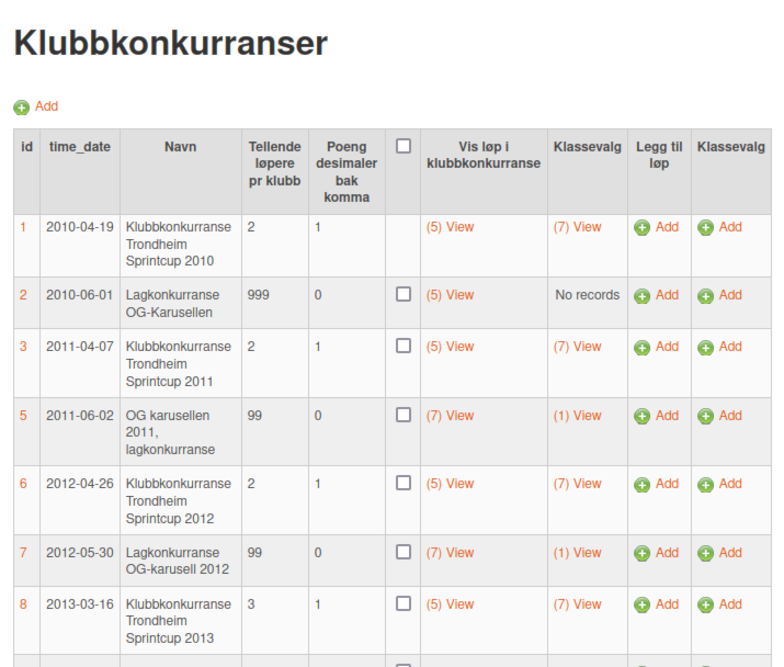 | Da får du en liste over alle klubbkonkuransene. Du må bla helt ned til bunnen for å finne de nyeste konkuransene. Nå velger du add i kolonnen Legg til løp for årets OG-karusell. For eksempel "OG-karusellen lagkonkuranse 2023" | |