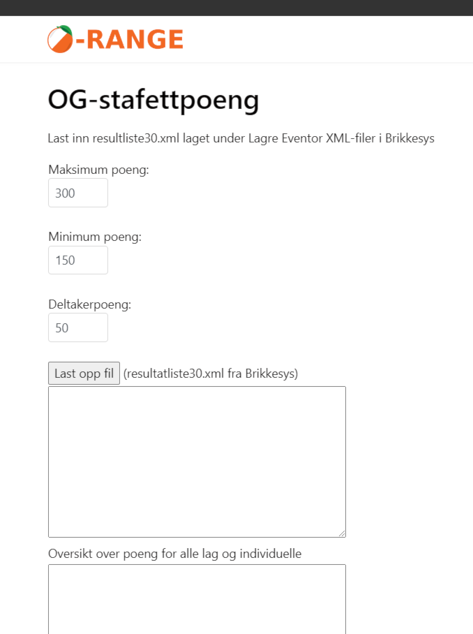 Her kan du sette makspoeng og minpoeng og deltakerpoeng. Tallene som ligger på siden nå er riktig for sesong 2023. Trykk på knappen Last opp fil. | |